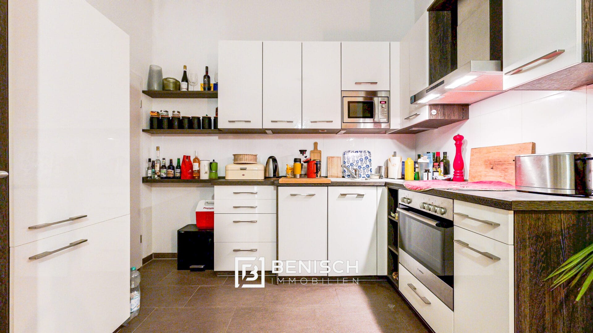 Der Mittelpunkt der Wohnung ist der Wohnbereich mit offener Küche. Die moderne Einbauküche mit hochwertigen Geräten fügt sich ruhig in den Raum ein, ohne seinen Charakter zu überlagern. Von hier aus besteht der Zugang zur Terrasse, die den Wohnraum nach außen erweitert. Zwei weitere Zimmer liegen separat und sind ohne Durchgangssituationen erreichbar – vielseitig nutzbar als Schlafzimmer, Arbeitsraum oder Kinderzimmer.